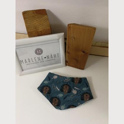wunderschönes Babyhalstuch in Dreieckform mit einem Druckknopf zum Schließen, liebevoll gefertigt aus Baumwolljersey mit Igelmuster und weichem, blauen Fleecestoff, beidseitig tragbar, für Babies von 0 - 6 Monaten geeignet (Halsweite ca. 36 cm)