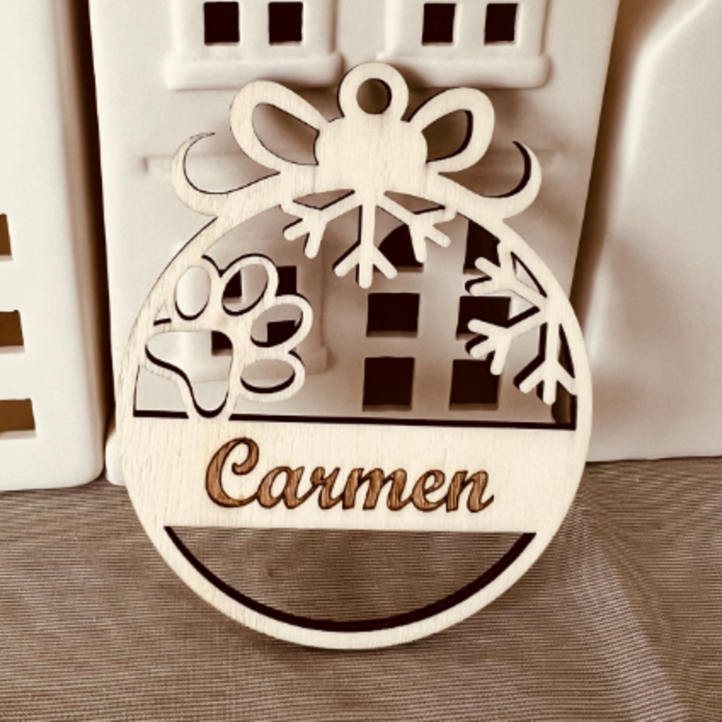 Weihnachtsanhänger aus Holz gelasert mit Namen personalisiert. Bitte den Wunschnamen oder Text bei Bestellung mit angeben. (maximal 20 Zeichen da sonst die Schrift sehr klein wird)