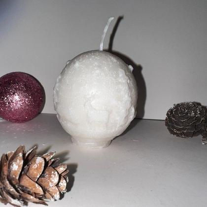 Kerze in Form einer Schneekugel mit Weihnachtsmuster (Santa mit Schlitten und Rentieren)