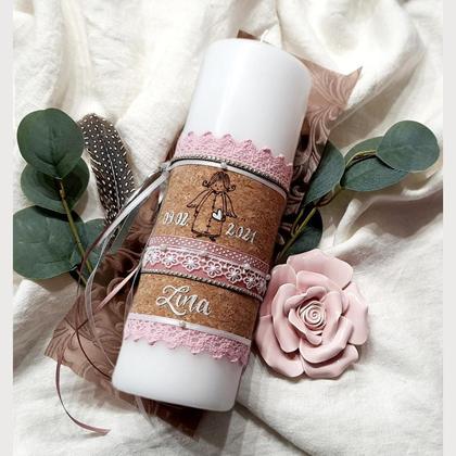 -Tischkerze mit passendem Untersetzer & Stabkerze inkl Aufbewahrungschachtel -Mädchen/Taufe -personalisierbar: Name (max. 2) & Datum -Kork -Von Hand beschriftet und bemalt -Bänder (können leicht variieren, je nach Verfügbarkeit) -Foto vor Lieferung
