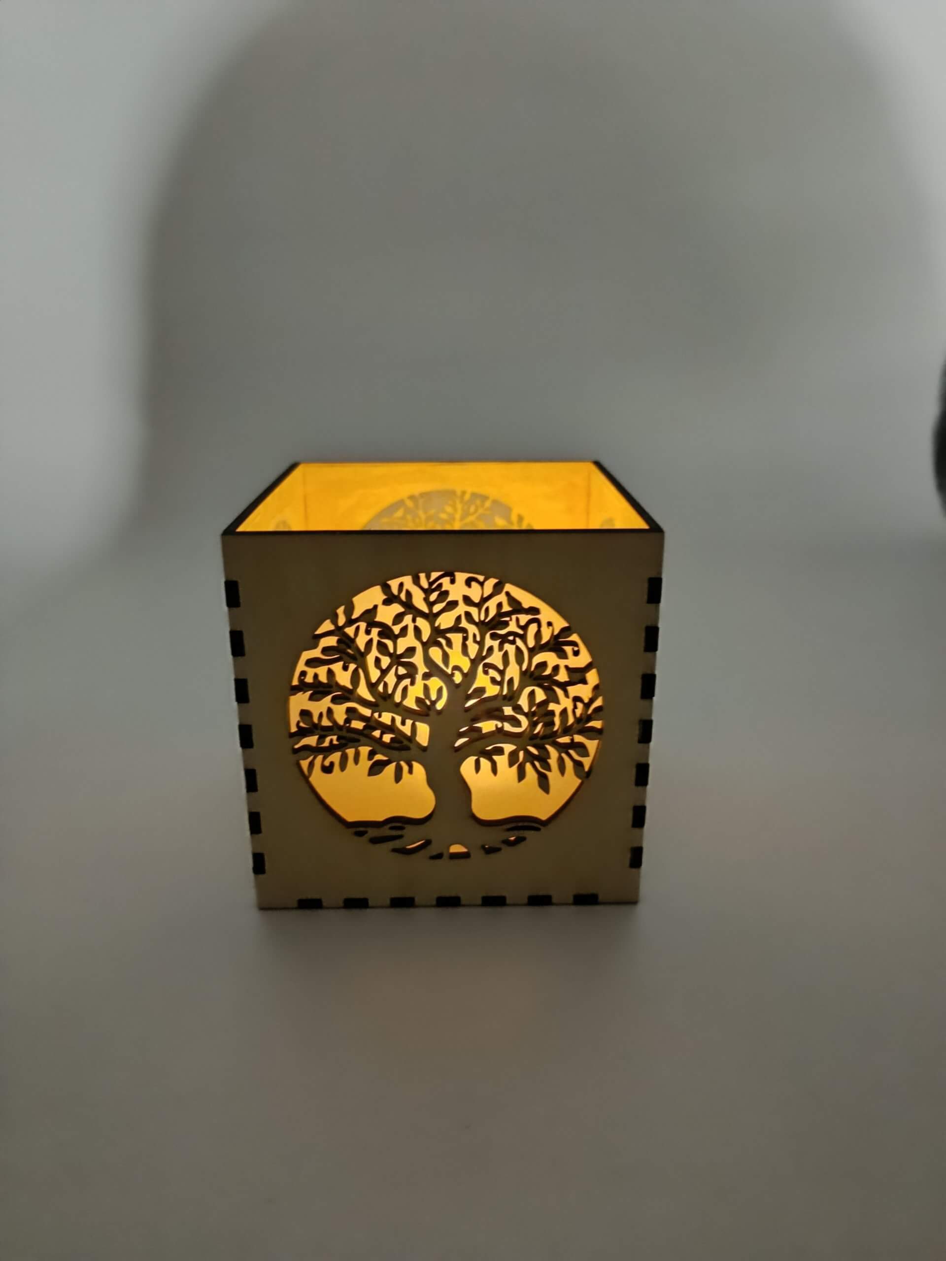 Windlicht Lebensbaum. Aus hochwertigem Birken oder Lindensperrholz. Inkl. Led Lampe mit Timerfunktion. Größe ca. 10,5 x 10,5 x 10,5 cm.