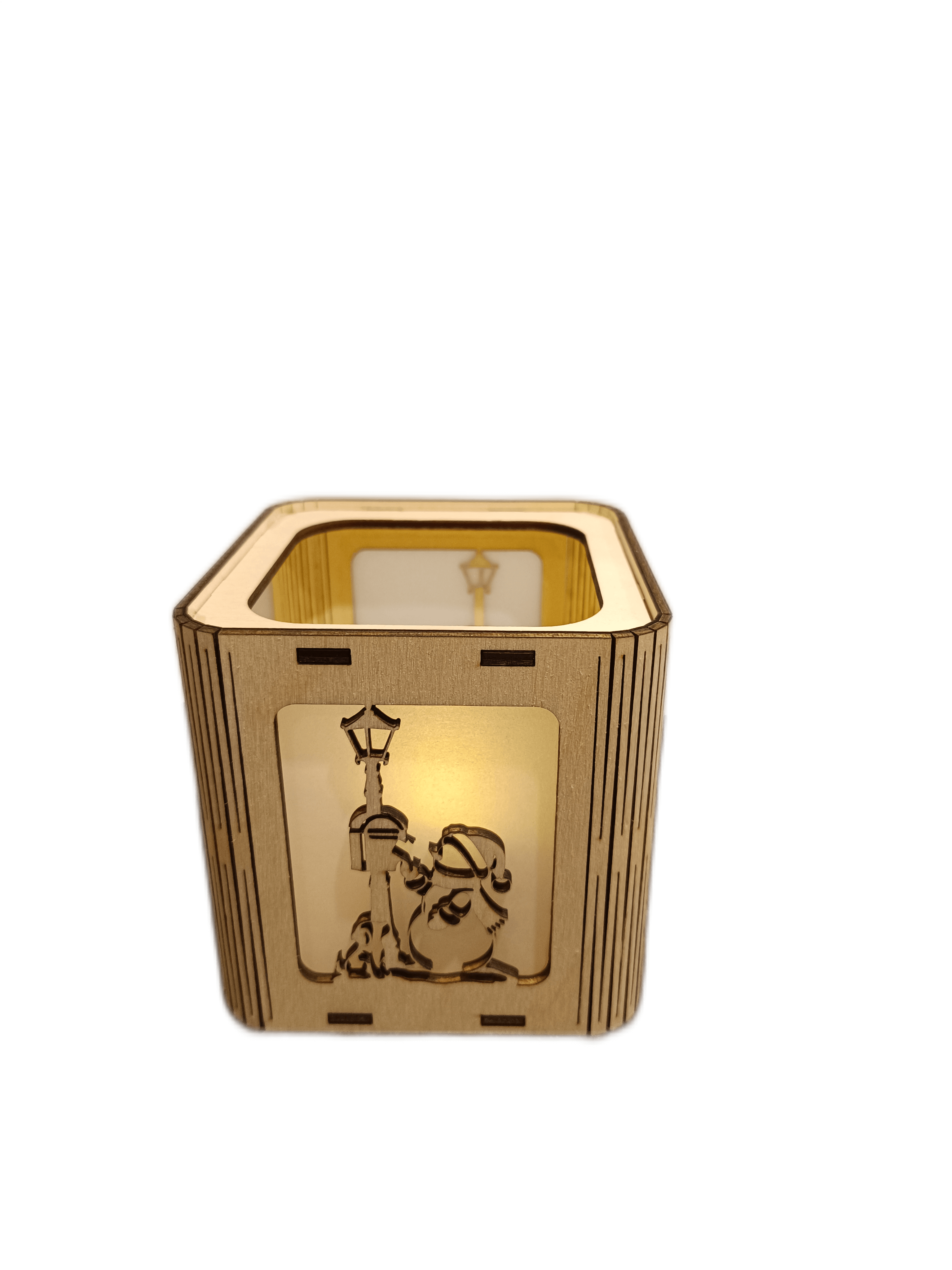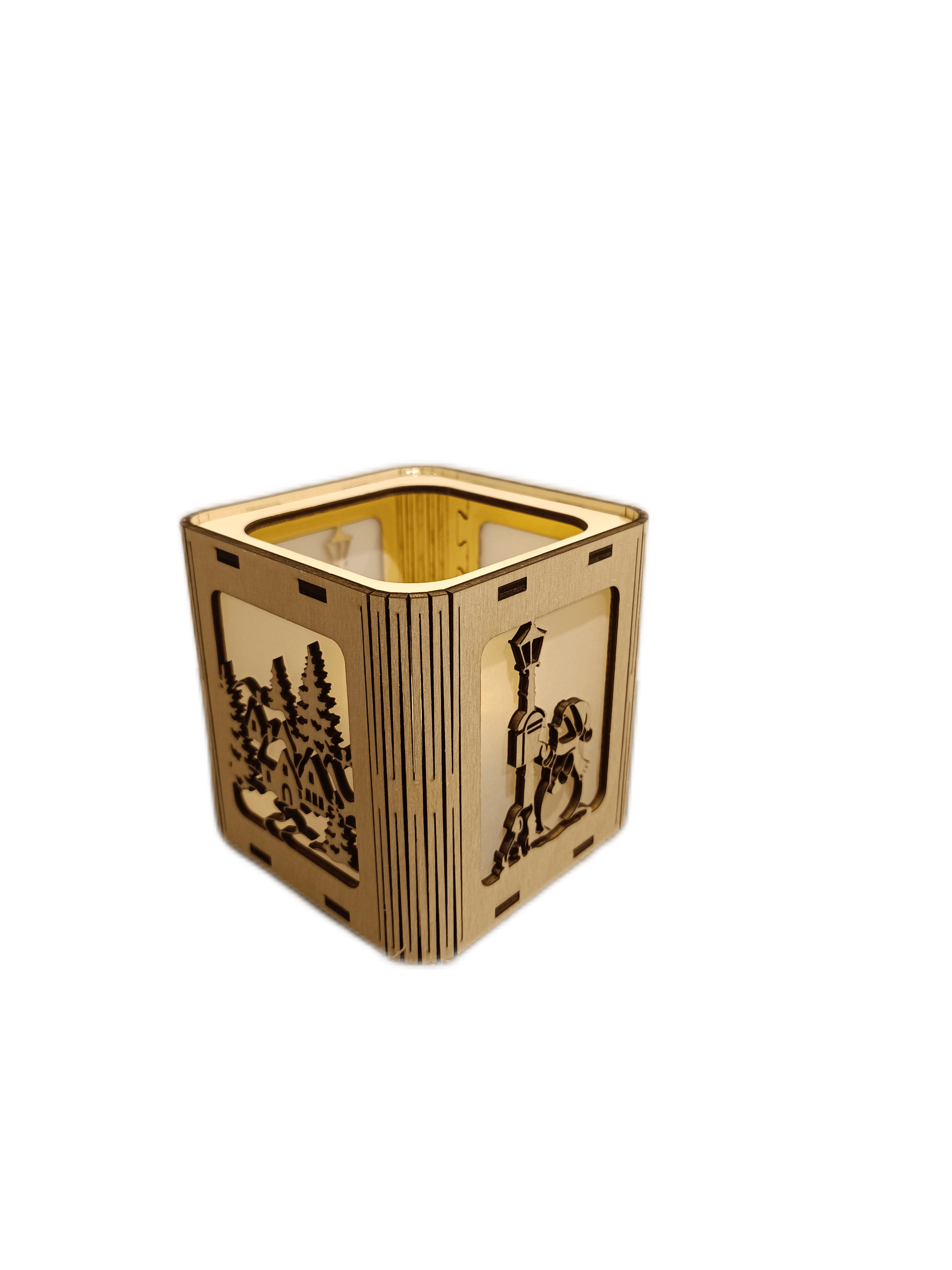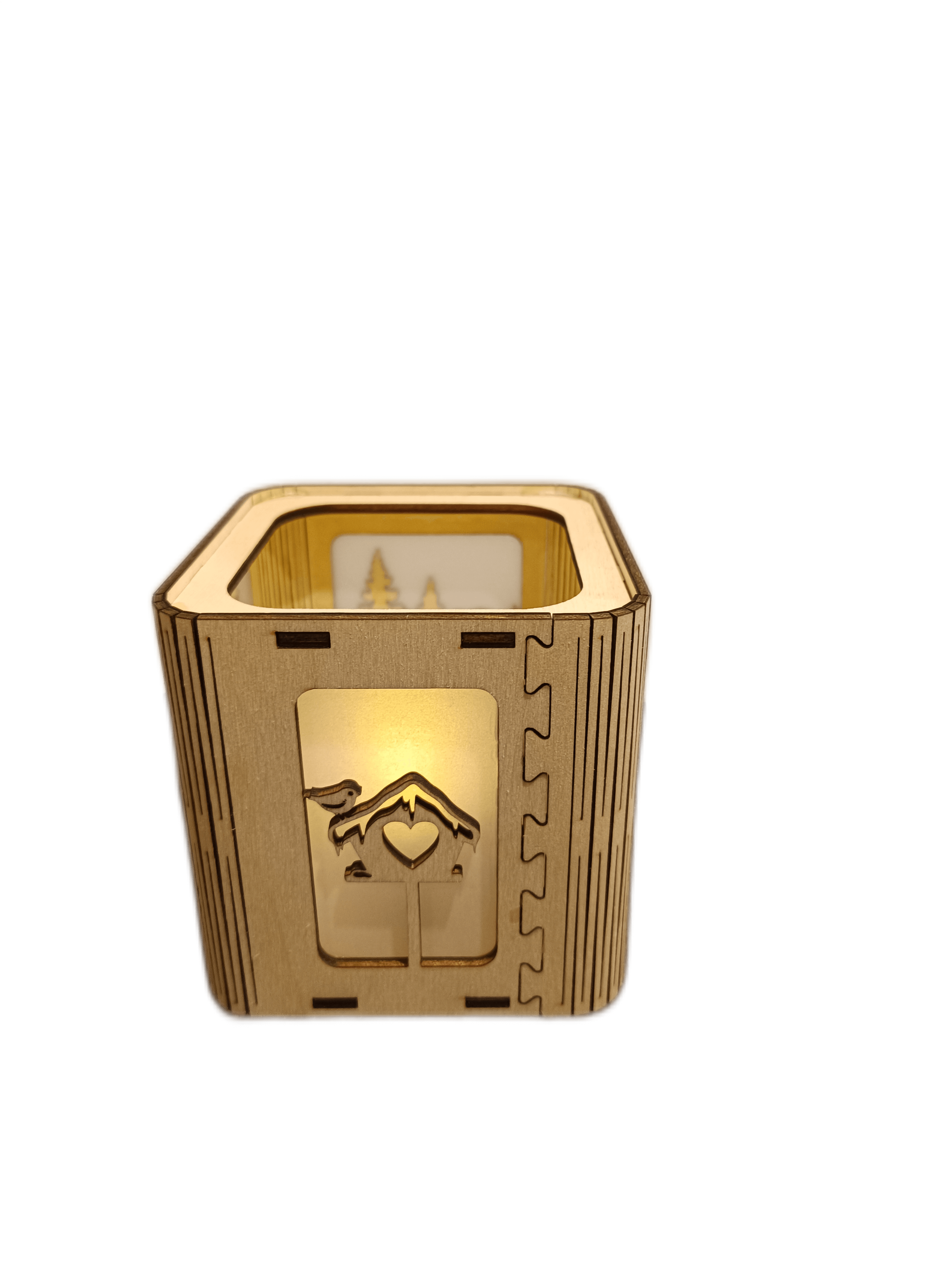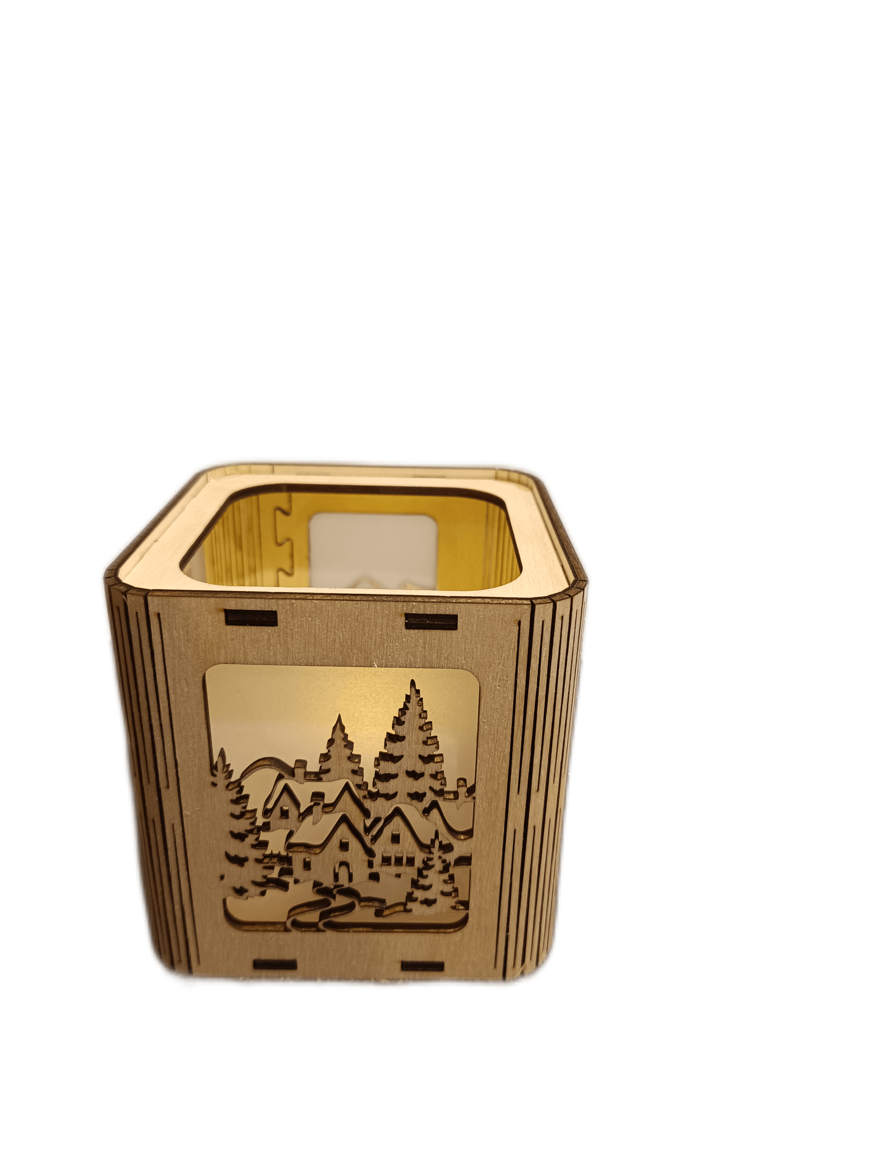 Windlicht Winterwelt, verschiedene Motive, siehe Fotos. Aus hochwertigem Birken oder Lindensperrholz. Inkl. Led Lampe mit Timerfunktion. Größe ca. 10 x 10 x 10 cm.