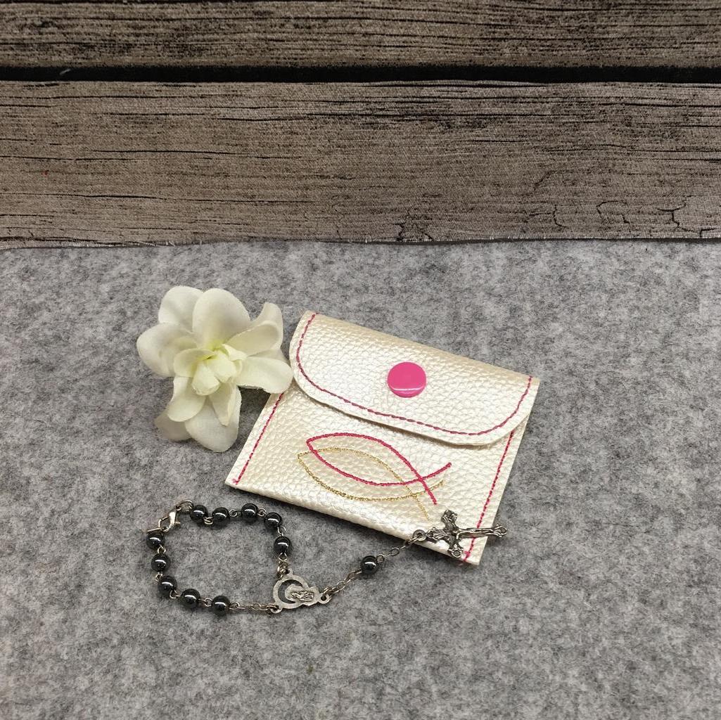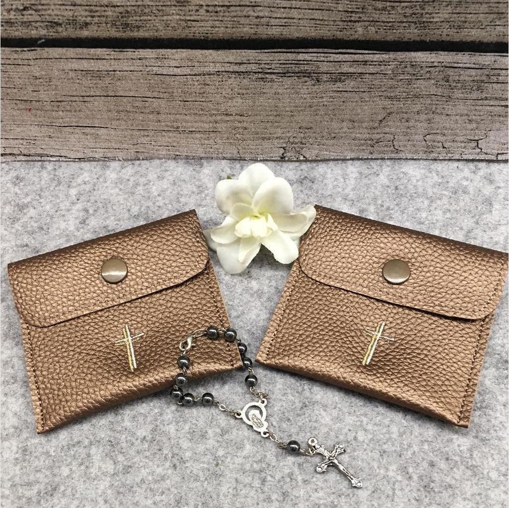 Schönes Rosenkranztäschchen aus Filz oder Kunstleder bestickt mit Motiv. Das Täschchen wird mit einem Druckknopf geschlossen. Auf Wunsch kann auch der Name des Kindes oder das Datum der Erstkommunion aufgestickt werden. Aufpreis € 2,00. zwei verschiedene Motive wählbar. Verschiedene Farben bei Kunstleder für des Täschchen wählbar: rohweiß, hellbraun, dunkelbraun, rosa, blau. Bei Filz: hellgrau, dunkelgrau weinrot. Größe: ca. B/H 8 x 7 cm
