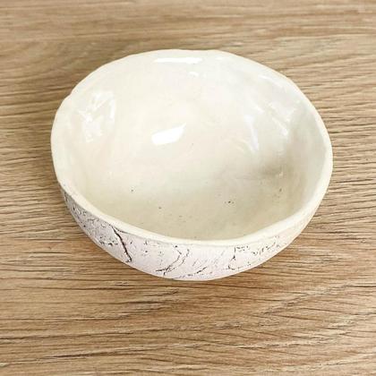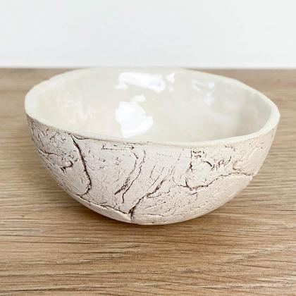 3er-Set handgemachte Keramikschüsseln. Die Schüsseln wurden außen mittels Druck-Muster verziert, wodurch sie ihren natürlichen Charakter erhalten. Die Vertiefungen wurden geschwärzt und dadurch sichtbar gemacht. Innen wurden die Schüsseln transparent glasiert. Durchmesser: 9,5cm Höhe: 4,5cm Nicht Spülmaschinen geeignet.