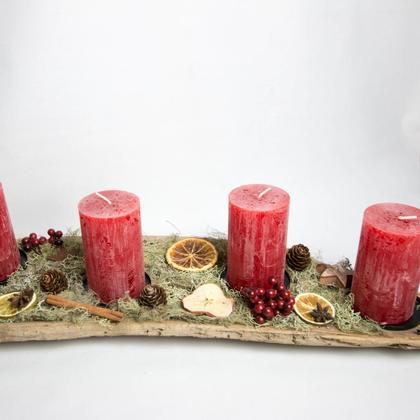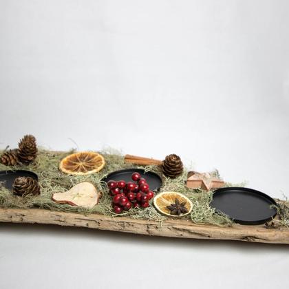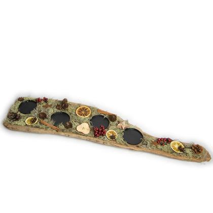 Dieser Adventskranz der etwas anderen Art besteht aus einem Stück Treibholz aus der Drau, das mit viel Liebe zum Detail weihnachtlich verziert wurde. Die Dekoration besteht aus 4 Kerzentellern, grauem Moos, Apfel- und Orangenscheiben, Holzsternen, Zimt, Anis sowie einigen Zapfen. Länge: 75cm Breite: 18cm Höhe: ca. 4cm (ohne Kerzen)