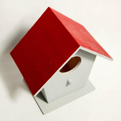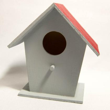 Dieses kleine Vogelhäuschen wurde aus Sperrholzplatten gefertigt und anschließend mit grauer und roter Farben bemalt.