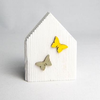 Dieses kleine Holzshäuschen bringt ganz bestimmt Frühlingsstimmung in euer Zuhause! Das Holzhäuschen wurde mit weißer Kreidefarbe bemalt. An der Vorderseite wurde es durch zwei grün und gelb bemalte, kleine Holzschmetterlinge verziert. Höhe: 9cm Breite: 7cm Tiefe: 4,5cm