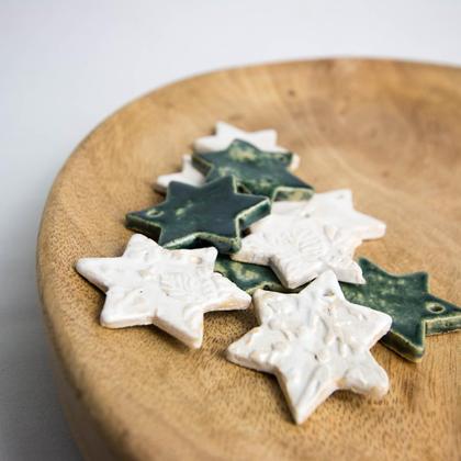 Dieser handgemachte Keramikstern wurde aus weißem Ton hergestellt. Auf der Oberseite wurde der Stern dunkelgrün, mit einem abrinnenden Effekt, glasiert. Die Unterseite ist natürlich belassen. Der Stern kann entweder als reine Dekoration, aber auch als Geschenkanhänger oder Christbaumschmuck verwendet werden. Durchmesser: 4,5cm