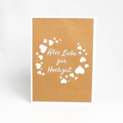 Überrascht eure Liebsten doch mit einer tollen, personalisierten Karte! Die Karten werden mit viel Liebe zum Detail hergestellt. Die kleinen Herzen wurden aus dem Kraftpapier herausgestanzt und der Schriftzug "Alles Liebe zur Hochzeit" wurde auf die Karte geplottet. Die Karte klebt auf einem weißen Kraftpapier-Billett. Format: A6
