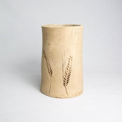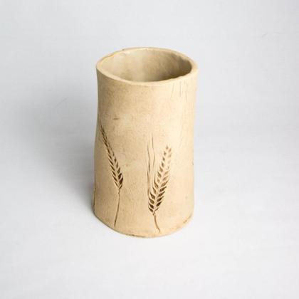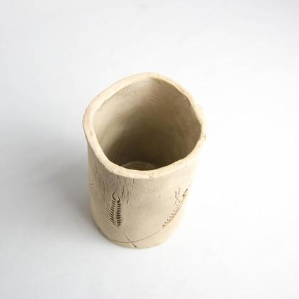 Diese handgemachte Vase wurde außen mittels Pflanzen-Druck-Muster verziert, wodurch sie ihren natürlichen Charakter erhält.