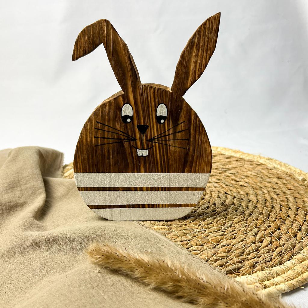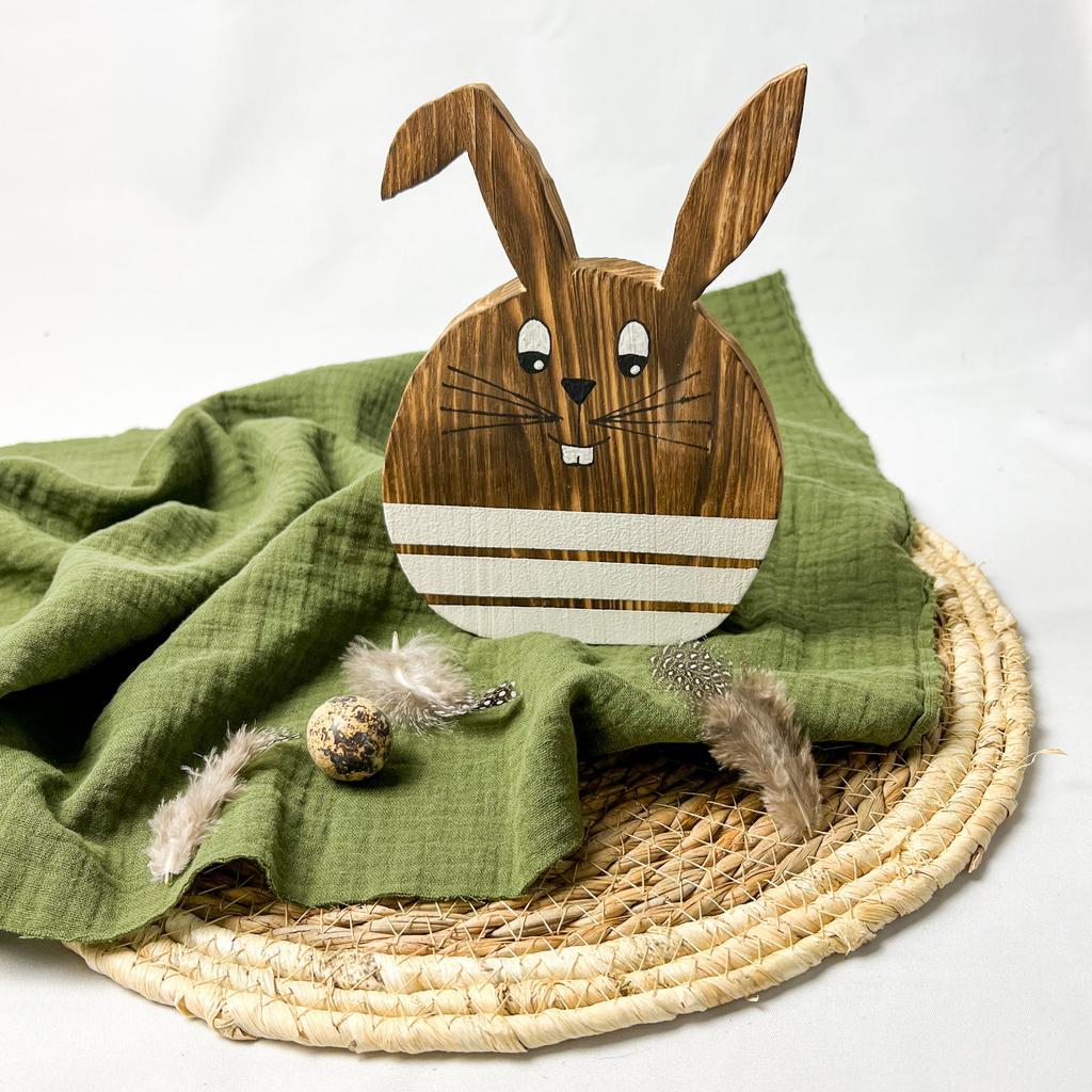 Dekorativer Osterhase aus geflämmtem Holz. Der kleine Osterhase ist unten durch drei weiße, aufgemalte Streifen akzentuiert. Höhe: 22cm Breite: 13cm
