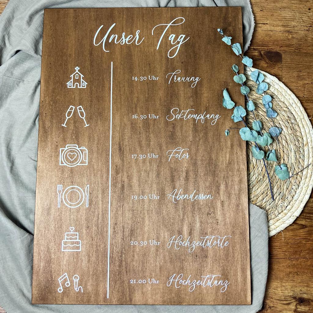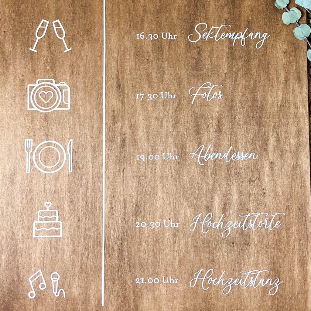 Holzschild Hochzeitsablauf Das Holzschild Hochzeitsablauf ist eine wunderschöne und praktische Ergänzung für jede Hochzeitsfeier. Das Schild kann individuell gestaltet werden, um euren ganz besonderen Tag auf elegante und übersichtliche Weise darzustellen. Das Schild ist nicht nur ein dekoratives Element, sondern auch ein praktisches Hilfsmittel, um den Ablauf des Tages zu organisieren und den Gästen Orientierung zu geben. Es kann an einem zentralen Ort aufgestellt werden, um die Gäste über den Ablauf des Tages zu informieren. Das Holzschild ist aus 6mm dickem Pappelholz gemacht, welches in der Farbe Nussbaum gebeizt ist. Dadurch hat es eine schöne dunkelbraune Farbe. Die Schrift ist mit weißer Folie aufgeplottet. Solltet ihr eine andere Hintergrundfarbe oder Schrift wollen, schreibt uns gerne eine Nachricht! Wir tun unser bestes, um eure Wünsche zu erfüllen. Höhe: 60cm Breite: 42cm