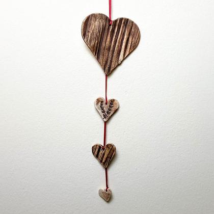 Keramikaufhänger in Herzform mit unterschiedlichen Pflanzen- und Holzmustern. Das große Herz und eines der kleineren wurden durch Holzdruck verziert, die anderen beiden kleineren durch Pflanzendruck. Durch Schwärzen wurden die Vertiefungen sichtbar gemacht und die Pflanzen bzw. die Holzoptik wurde sichtbar. Die Herzen sind mittels eines weinroten Bandes miteinander verbunden. Gesamtlänge: 43cm Durchmesser großes Herz: 12cm