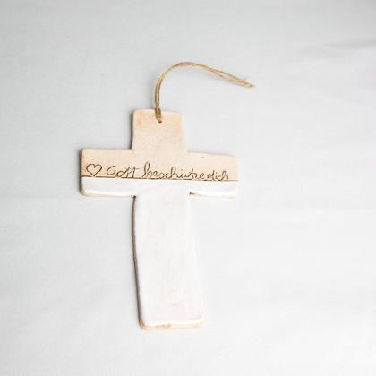 Dieses handgemachte Kreuz aus Keramik wurde aus weißem Ton gefertigt. An der Oberseite ist es durch den Schriftzug "Gott beschütze dich" und ein Herz verziert. Die Vertiefungen wurden geschwärzt und dadurch sichtbar gemacht. Der untere Teil des Kreuzes wurde weiß-glänzend glasiert. Eine Jutekordel dient als Aufhänger. Höhe: 17,5cm Breite: 11,5cm