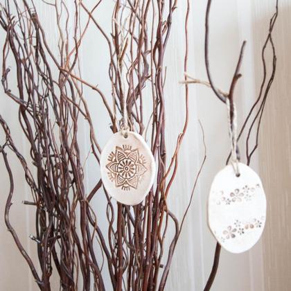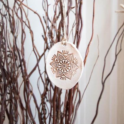 Dieser handgemachte Osterschmuck aus Keramik wurde aus weißem Ton gefertigt. An der Oberseite ist er durch einen Stempeldruck verziert. Die Vertiefungen wurden geschwärzt und dadurch sichtbar gemacht. Eine Jutekordel dient als Aufhänger. Höhe: 7cm Breite: 5cm
