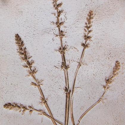 Dieses handgemachte Keramik-Bild wurde aus weißem Ton gefertigt. Die Pflanzen wurden in den noch feuchten Ton gedrückt und die Abdrücke wurden nach dem Brennen geschwärzt und dadurch sichtbar gemacht. Als Aufhänger dient eine braune Kordel. Höhe gesamt: 25cm Breite: 13cm