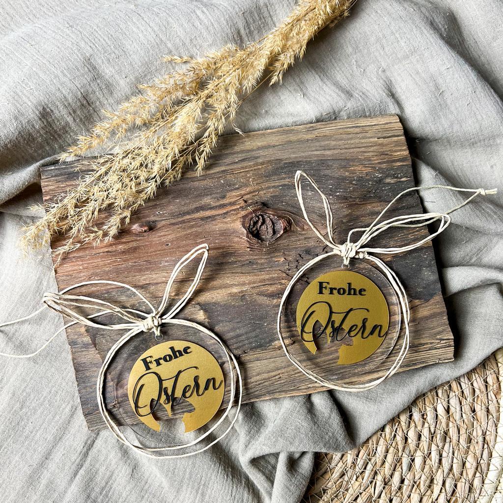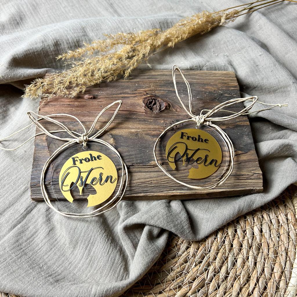 Unser Osteranhänger ist eine süße Dekoration für die Oster- und Frühlingszeit! Er besteht aus einer klaren Acrylscheibe, die mit goldener Vinylfolie beklebt ist. Auf der Rückseite befindet sich ein süßer Hasenausschnitt in der Folie und auf der Vorderseite ist der Schriftzug "Frohe Ostern" in schwarz angebracht. Dies verleiht dem Anhänger ein elegantes und festliches Aussehen. Die Acrylscheibe ist von einem Papierdraht eingerahmt, der oben zu zwei Hasenohren geformt ist. Ein zusätzliches Bändchen dient als Aufhänger. Die Scheibe ist sehr leicht und kann daher einfach an einem Osterstrauß, am Fenster oder an anderen geeigneten Stellen aufgehängt werden. Der Osteranhänger ist eine tolle Möglichkeit, um dein Zuhause in der Osterzeit zu schmücken und eine warme und freundliche Atmosphäre zu schaffen. Er eignet sich auch als Geschenk für Freunde und Familie, um ihnen frohe Ostern zu wünschen. Höhe: 13cm Breite: 9cm