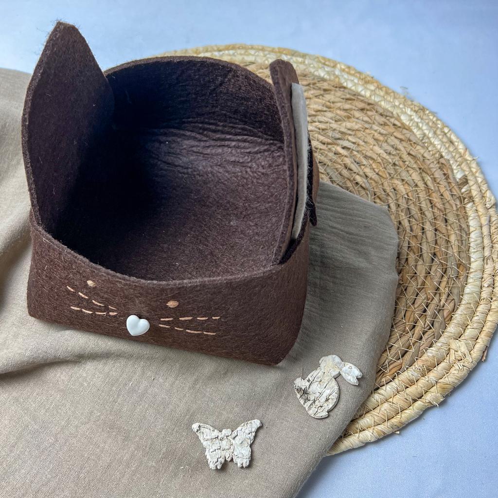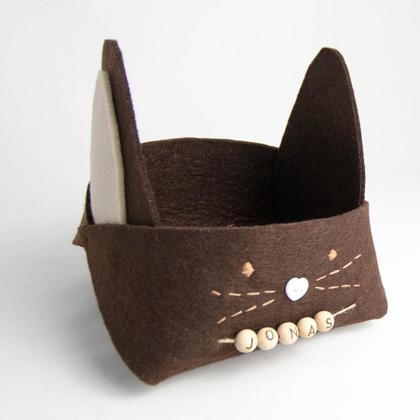 Dieses süße, handgemachte Osterkörbchen wurde aus Filz gefertigt. An der Vorderseite wurden Barthaare und Augen aufgestickt. Die Nase des Häschens besteht aus einem Knopf in Herzform Es ist das ideale Ostergeschenk für Groß und Klein! Auf Wunsch kann der Name mittels gravierten Holzperlen hinzugefügt werden. Länge: 16cm Breite: 16cm