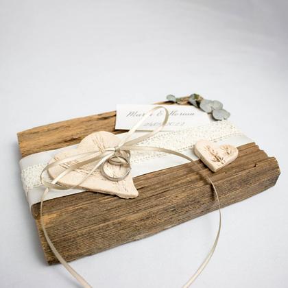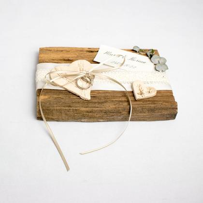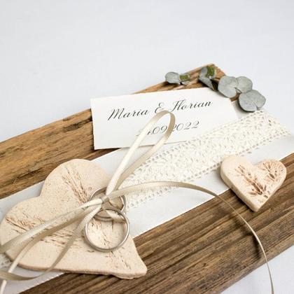 Dieses Ringkissen ist der Hingucker auf eurer Hochzeit! Das Altholzbrett wurde mit zwei handgemachten Keramik-Herzen, welche durch Pflanzen-Druck entstanden sind, sowie durch beige Bänder und einen getrockneten Eukalyptuszweig verziert. Auf dem dünnen, beigen Band können die beiden Ringe aufgefädelt und auf das große Herz gelegt werden. Die Namen sind auf einem elfenbeinfarbenen Papier aufgedruckt. Holz: alte Lärchenholzschindel Länge: ca. 23cm Breite: ca. 18cm