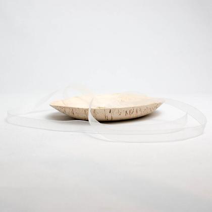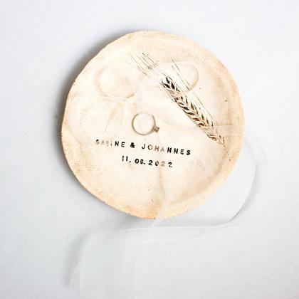 Diese Ringschale ist der Hingucker auf eurer Hochzeit! Die Schale wird per Hand aus weißem Ton getöpfert. Die Ähre sowie Name und Datum werden in den Ton gestempelt und anschließend durch Schwärzen sichtbar gemacht. Die Unterseite der Schale ist in Holzoptik. Auf dem dünnen, weißen Organzaband, welches durch 2 kleine Löcher gefädelt wird, können die beiden Ringe aufgefädelt werden. Durchmesser: 14cm Höhe: 2cm