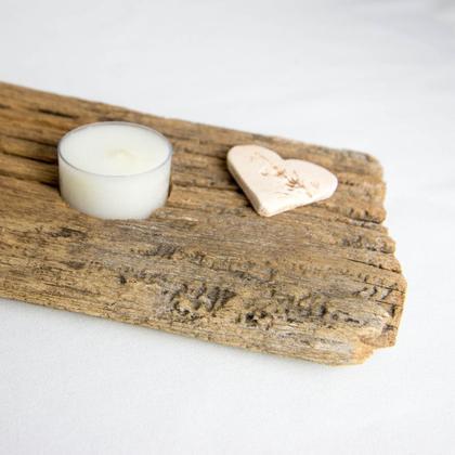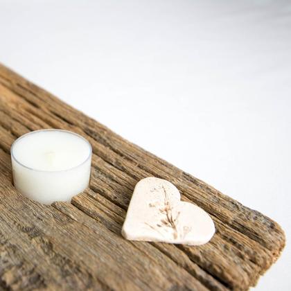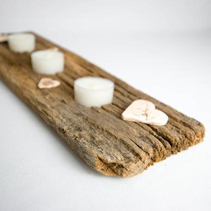 Altholzbretter eignen sich sehr gut als Teelichthalter. Dieses bietet Platz für 3 Teelichter und wurde zusätzlich noch mit 4 handgemachten Keramikherzen mit Pflanzen-Druck-Muster verziert. Länge: ca. 40cm Breite: ca. 11cm Holz: Lärche