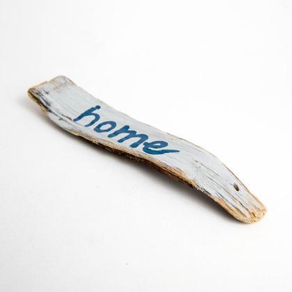 Das Schild wurde aus einem Treibholzstück aus der Drau gefertigt. Der Schriftzug "home" wurde per Hand mit dunkelblauer Farbe auf das mit blau-grauer Farbe grundierte Holz geschrieben. Das Schild kann entweder als lose Streudeko verwendet werden, oder als Aufhänger. Länge: 24cm Breite: 5cm