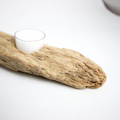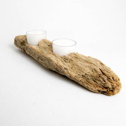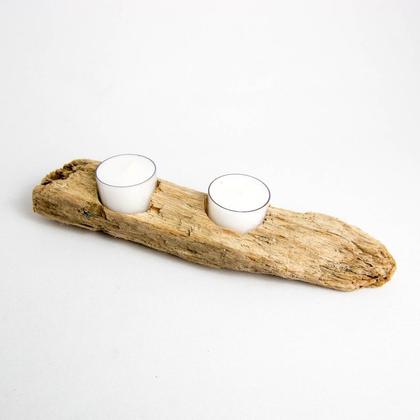 Teelichthalter, der aus einem Stück Treibholz aus der Drau gefertigt wurde. Der Teelichthalter bietet Platz für zwei Teelichter. Länge: ca. 24,5cm Breite: ca. 5cm