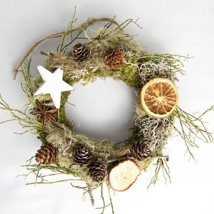 Weihnachtlich geschmückter Natur-Türkranz. Der Kranz besteht aus einem Mooskranz, der durch Zweige, graues Moos und weihnachtliche Accessoires, wie Orangen- und Apfelscheiben, Anis, einen Holzstern und Zapfen verziert ist. Eine Jutekordel dient als Aufhänger. Durchmesser: ca. 20cm