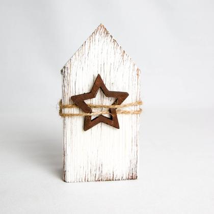 Dieses kleine Holzhäuschen bringt ganz bestimmt Weihnachtsstimmung in euer Zuhause! Das Häuschen wurde geflämmt und anschließend mit weißer Kreidefarbe im Shabby Chic-Stil bemalt. An der Vorderseite wurde es durch einen braun bemalten, kleinen Holzstern, der mit einer Jutekordel befestigt ist, verziert. Höhe: 13,5cm Breite: 6,5cm Tiefe: 4cm