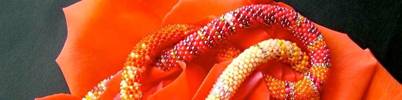 Mein Glasperlenschmuck erzählt, in dreidimensional gestalteten Designs und Musterungen, Geschichten in Bildern aus Glasperlen.