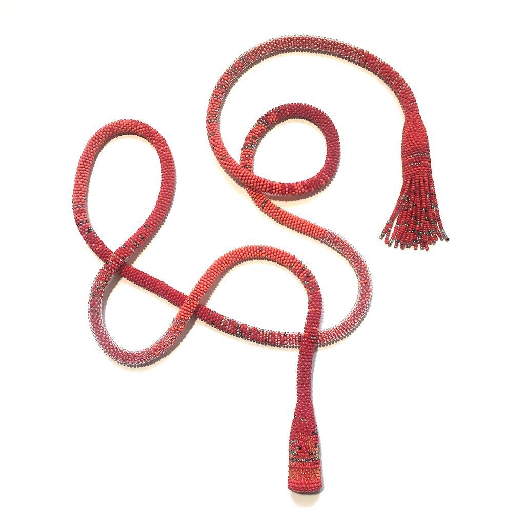 Länge des Gürtels 150cm In dieser traditionellen Technik des Häkelns von Glasperlen werden für diesen Gürtel Glasperlen nach einem von mir entworfenen Muster auf ein Baumwollgarn gefädelt. Jede gefädelte Perle wird schließlich einzeln zu einem Schlauch gehäkelt. Die Enden des Gürtels sind Tulpenförmig. Der Durchmesser des Gürtels beträgt etwa einen Zentimeter. In einem milden Seifenbad lässt sich der Gürtel reinigen. Bringen Sie bitte Ihre Hautpflege (Parfum) nicht in direkten Kontakt mit den Glasperlen.