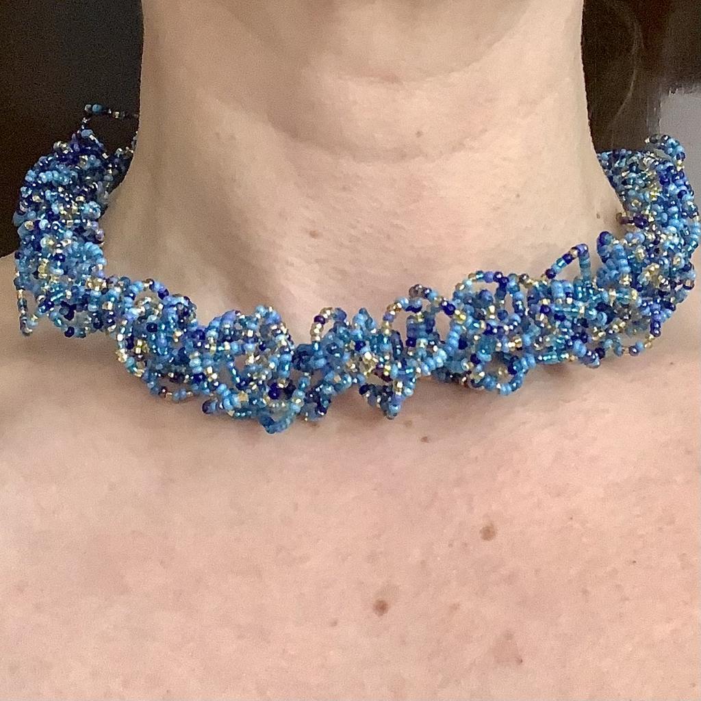 Knautschketten sind flexibel dehnbare Halsketten aus Glasperlen ohne Verschluss. So ergibt sich rundum ein perfektes Bild. Einfach über den Kopf ziehen und wie Haarlocken knautschen-ziehen-formen. Nach dem Tragen die Kette in die Hände legen und wie beim Knödel formen etwas zusammendrücken und im Organza Säckchen aufbewahren. In einem milden Seifenbad lässt sich die Kette reinigen. Bringen Sie bitte Ihre Hautpflege (Parfum) nicht in direkten Kontakt mit den Glasperlen.
