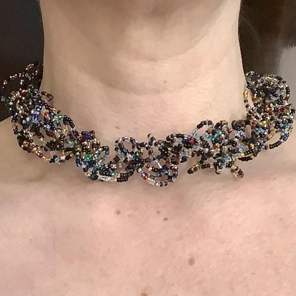 Knautschketten sind flexibel dehnbare Halsketten aus Glasperlen ohne Verschluss. So ergibt sich rundum ein perfektes Bild. Einfach über den Kopf ziehen und wie Haarlocken knautschen-ziehen-formen. Nach dem Tragen die Kette in die Hände legen und wie beim Knödel formen etwas zusammendrücken und im Organza Säckchen aufbewahren. In einem milden Seifenbad lässt sich die Kette reinigen. Bringen Sie bitte Ihre Hautpflege (Parfum) nicht in direkten Kontakt mit den Glasperlen.