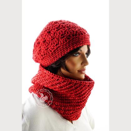 Handgestrickter Loop und gehäkelte Haube im Set. Aus handgefärbter, bester (Merino-) Schurwolle.