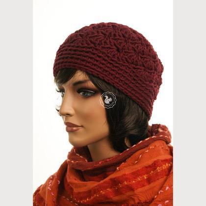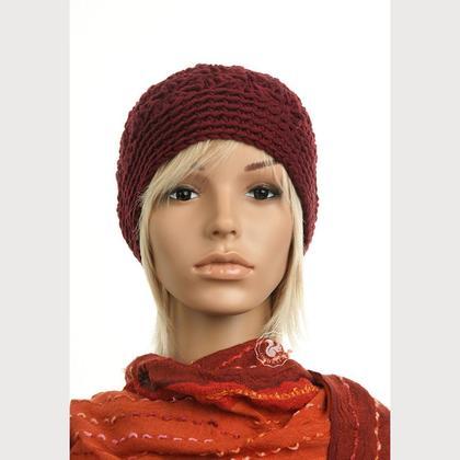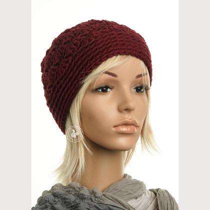 Haube, handgefertigt aus bester Merino-Schurwolle in der Farbe weinrot.