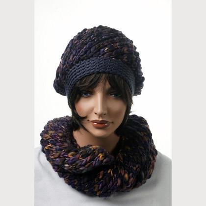 Haube, handgefertigt aus großteils unregelmäßig gesponnener, handgefärbter Merino-Schurwolle in verschiedenen Erdtönen und etwas Lila. Dazu im Set zwei passende Loops, die alleine oder in Kombination getragen werden können.