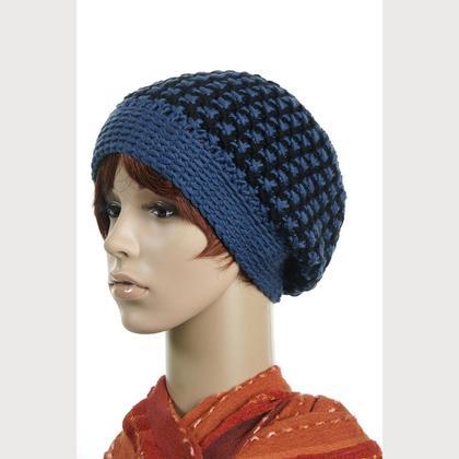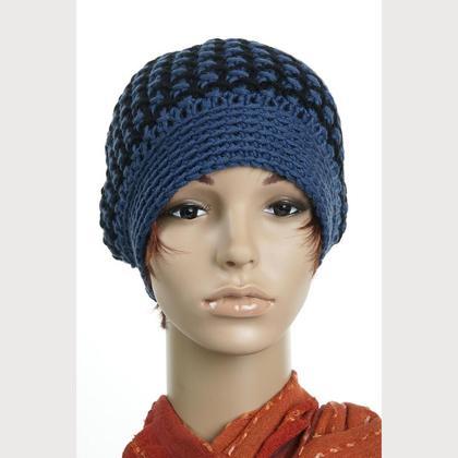 Hangestrickte Haube aus feinster, reiner (Merino-) Schurwolle - Hahnentritt-Muster in blau/schwarz