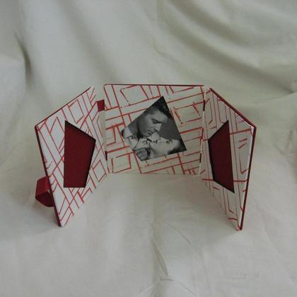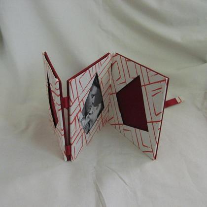 Handgefertigter klappbarer 3-teiliger Leporello-Fotorahmen mit rotem geometrischen Dekor und rotem Buchbinder-Leinen mit Satinbändern für schwarz-weiss und Farbfotos zum Hängen, Stellen und zum Mitnehmen Gesamtlänge ca. 35 cm