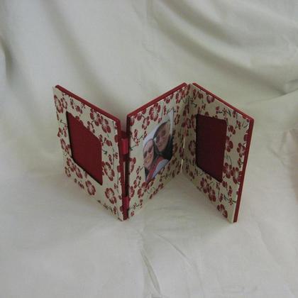 Handgefertigter klappbarer 3-teiliger Leporello-Fotorahmen aus rot-beige-grünem indischem Papier mit rotem Buchbinder-Leinen und mit Satinbändern für schwarz-weiss und Farbfotos zum Hängen, Stellen und zum Mitnehmen Gesamtlänge ca. 35 cm