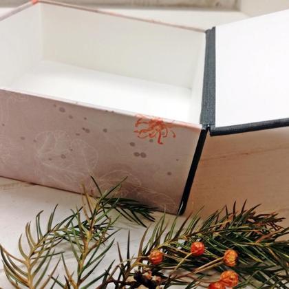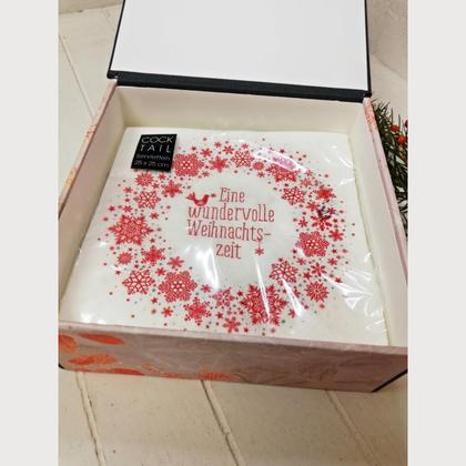 Schöne selbst gebundene Box mit Klappdeckel. Ideal um Erinnerungen aufzubewahren, persönliches stilvoll zu verschenken oder wie hier mit Cocktailservietten zu bestücken. *Details* Format: 14x13,8cm, Höhe 5cm hat somit Platz für 2Pkg. Cocktailservietten Inhalt nun: 1 Pkg. weihnachtliche Cocktailservietten Box und Klappdecke ist aus 2mm Pappe, Buchleinen und Designerpapier gebunden das Designerpapier: ist 200g/m² FSC-zertifiziertes Naturpapier mit Offset-Druck, welches in Deutschland produziert wird **Technische Details** Bitte beachte, dass die Farben je nach Monitoreinstellung etwas von den Originalfarben abweichen können
