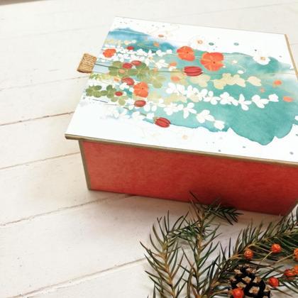 Schöne selbst gebundene Box mit Klappdeckel. Ideal um Erinnerungen aufzubewahren, persönliches stilvoll zu verschenken oder wie hier mit Cocktailservietten zu bestücken. *Details* Format: 14x13,8cm, Höhe 5cm hat somit Platz für 2Pkg. Cocktailservietten Inhalt nun: 1 Pkg. weihnachtliche Cocktailservietten Box und Klappdecke ist aus 2mm Pappe, Buchleinen und Designerpapier gebunden das Designerpapier: ist 200g/m² FSC-zertifiziertes Naturpapier mit Offset-Druck, welches in Deutschland produziert wird **Technische Details** Bitte beachte, dass die Farben je nach Monitoreinstellung etwas von den Originalfarben abweichen können