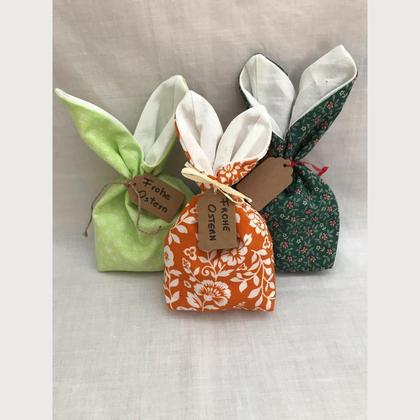 --Osterhäschentasche-- Das Häschen kann mit Süßigkeiten gefüllt und kann immer wieder verwendet werden, mit Band und Anhänger. Größe: Höhe 12 cm, mit Ohren 21 cm Breite 12 cm Das Häschen wird aus Baumwollstoffresten oder alten Hemden usw. hergestellt, damit wir die Umwelt ein klein wenig schützen. Bitte Farbwunsch bekanntgeben, gerne sende ich dir auch Fotos von meinen Stoffen.
