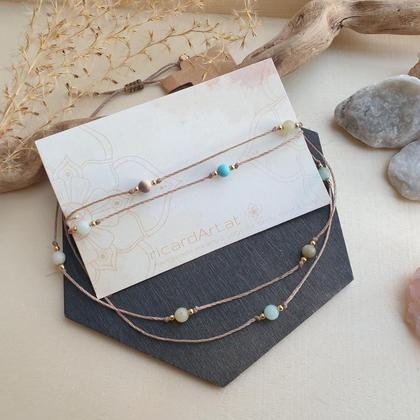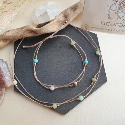 Von Hand gefertigtes, doppelreihiges Edelsteinarmband aus gewachstem Makrameegarn (strapazierfähig & wasserfest), mit natürlichen Amazonit & Türkisperlen (4mm) & 18k vergoldeten Kupferperlen (2mm). - Mit längenverstellbarem Schiebeverschluss zum individuellen anpassen *du bekommst dein Schmuckstück hübsch verpackt in einer handbedruckten Box aus recyceltem Altpapier, mit persönlichem Steckbrief beigelegt auf dem du die wichtigsten Infos zu deinem neuen Begleiter nachlesen kannst