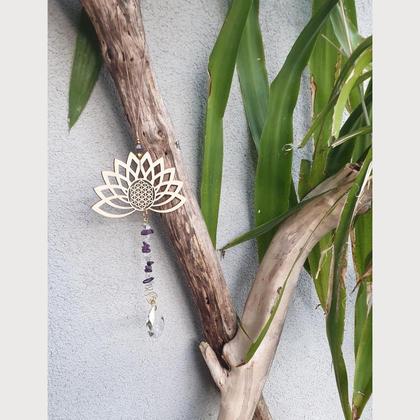 Hol dir Licht & Harmonie ins Haus!!! Der Sonnenfänger liebt es besonders vor Fenstern zu hängen. Laut Fengh Shui soll so verhindert werden, dass positive Energien zu schnell aus den Fenstern strömen. Die Lotusblüte ( Symbol für Weiblichkeit, Weisheit & Reinheit) ist aus Holz (14×7cm), mit eingravierter Lebensblume. Bestückt ist der hübsche Harmoniebringer mit natürlichen Amethyst-& Bergkristallperlen, sowie facettierten Prismaglaskristallen zur Aufspaltung & Reflexion des Sonnenlichts Fällt Licht auf einen Kristall, so zeigt sich das wunderbare Farbenspektrum des Regenbogens Bringt Harmonie an jeden Ort deiner Wahl Gesamtlänge ca. 17cm