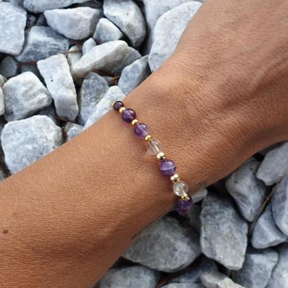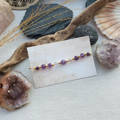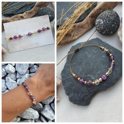 Amethyst & Bergkristall - wunderbare Schätze der Natur & eine starke Kombination für geistige Klarheit, inneren Fokus, Geisteskraft & bessere Konzentration. Der ideale Helfer auch bei Schlafschwierigkeiten, Suchtproblemen & in Lern-, & Prüfungssituationen Das Armband ist aus strapazierfähigem, wasserfestem Makrameegarn von Hand gefertigt & lässt sich durch den längenverstellbaren individuell anpassen. Mit natürlichem Amethyst & Bergkristall, sowie vergoldeten Hämatitperlen Du bekommst dein Armband hübsch verpackt, in einer handbedruckten Schmuckbox aus recyceltem Altpapier, mit persönlichem Steckbrief beigelegt, auf dem du die wichtigsten Infos zu deinem neuen Begleiter nachlesen kannst ♡