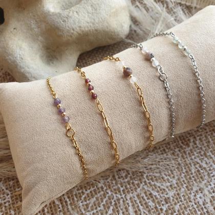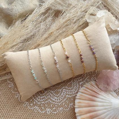 Hochwertige Armkettchen aus nickelfreiem, echtvergoldetem Edelstahl (wasserfest) mit Karabinerverschluss, 18k vergoldeten Kupferperlen & natürlichen Edelsteinen in facettiert geschliffener Kristallform (3-4mm) Du bekommst dein Armband hübsch verpackt in einer handbedruckten Box aus recyceltem Altpapier, mit persönlichem Steckbrief beigelegt, auf dem du die wichtigsten Infos zu deinem neuen Begleiter nachlesen kannst!