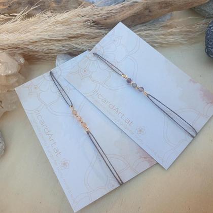 Hochwertige Armbänder aus wasserfestem Makrameegarn, mit 4mm facettierten Edelsteinen (Amethyst oder Mondstein), 18k vergoldeten Kupferperlen & längenverstellbarem Schiebeverschluss zum individuellen Anpassen Du bekommst dein Armband hübsch verpackt in einer handbedruckten Box aus recyceltem Altpapier, mit persönlichem Steckbrief beigelegt auf dem du die wichtigsten Infos zu deinem neuen Begleiter nachlesen kannst