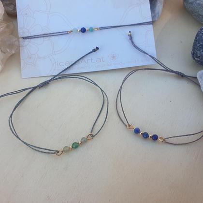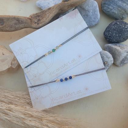 Hochwertige Armbänder aus wasserfestem Makrameegarn, mit 4mm facettierten Edelsteinen (Aventurin oder Lapislazuli), 18k vergoldeten Kupferperlen & längenverstellbarem Schiebeverschluss zum individuellen Anpassen Du bekommst dein Armband hübsch verpackt in einer handbedruckten Box aus recyceltem Altpapier, mit persönlichem Steckbrief beigelegt auf dem du die wichtigsten Infos zu deinem neuen Begleiter nachlesen kannst