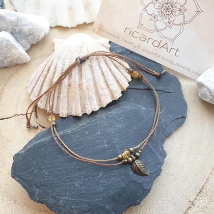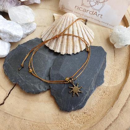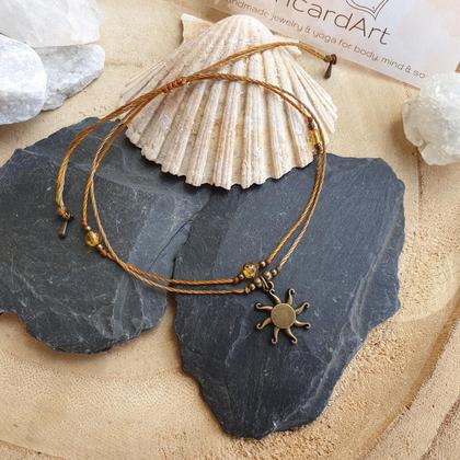 Doppelreihiges Fußband aus wasserfestem, sehr strapazierfähigem Makrameegarn (gewachst), mit natürlichen Citrinperlen (4mm) & nickelfreiem Sonne-Anhänger in bronze (14mm). Der längenverstellbare Schiebeverschluss lässt sich in der Größe individuell anpassen *du bekommst dein Schmuckstück hübsch verpackt in einem handbedruckten Naturleinenbeutel, mit persönlichem Steckbrief beigelegt auf dem du die wichtigsten Infos zu deinem neuen Begleiter nachlesen kannst CITRIN (Solarplexuschakra/ Manipūra) Lebensfreude ~ Energie ~ Lebensmut ~ Ein Powerstein & Energiespender Der Citrin bringt deine inneres Licht zum Strahlen Er schenkt dir Lebensfreude und ist ein wahrer Sonnenspender Besonders für dein inneres Gleichgewicht kann er von positiver Bedeutung sein - Ein idealer Begleiter in psychischen Krisen & belastenden Lebensphasen Sternzeichen: Löwe