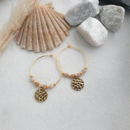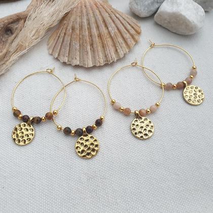 Vergoldete Edelstahlcreolen mit natürlichen Edelsteinen & Messinganhänger in antikgold Durchmesser Creolen: 35mm